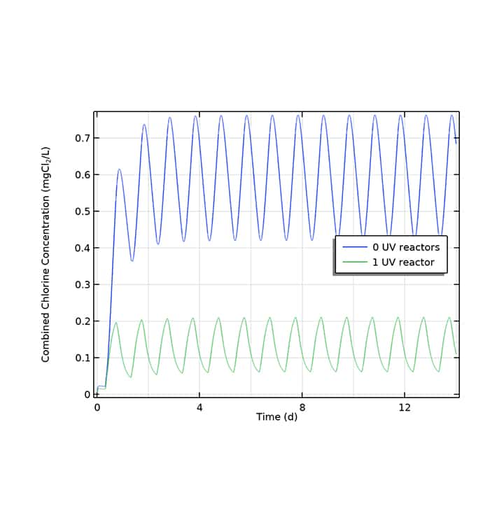 However, a healthier swimming environment can be created by predicting Dissolved Organic Carbon (DOC) and THM levels and dynamics in the water based on water quality modeling to assess the design of the swimming pools. With the inBlue pool model it is possible to calculate key water and air quality parameters like combined chlorine, THM, trichloramine and turbidity depending on the choice of key design parameters, such as flow and filtration technology.