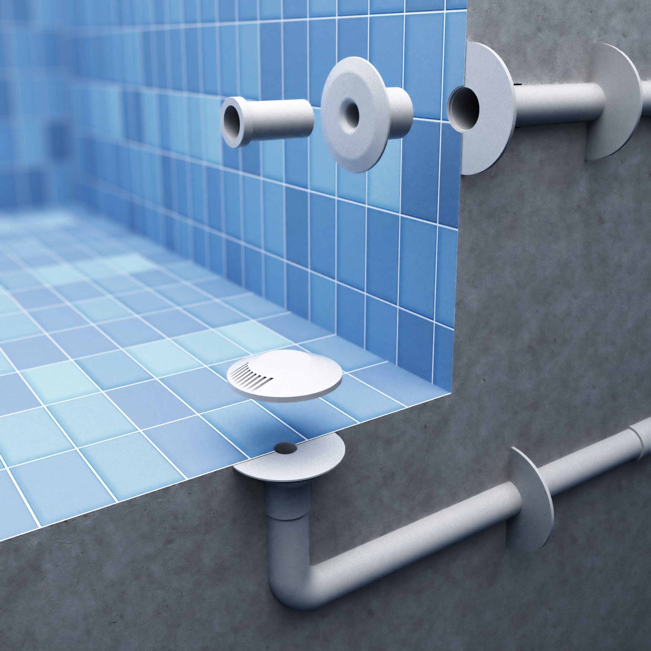 The inlets come in 3 different models, from which two are side inlets installed in the pool walls 20 cm above the pool floor level, and one model is a floor inlet placed in the pool floor. The floor inlets enhance the flow generated by the side inlets, which makes the water circulation more effective.